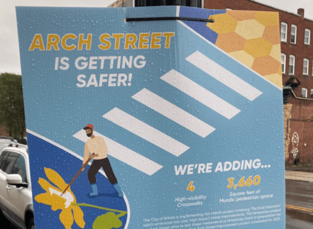 Sign that reads “arch street is getting safer,” by making it look prettier