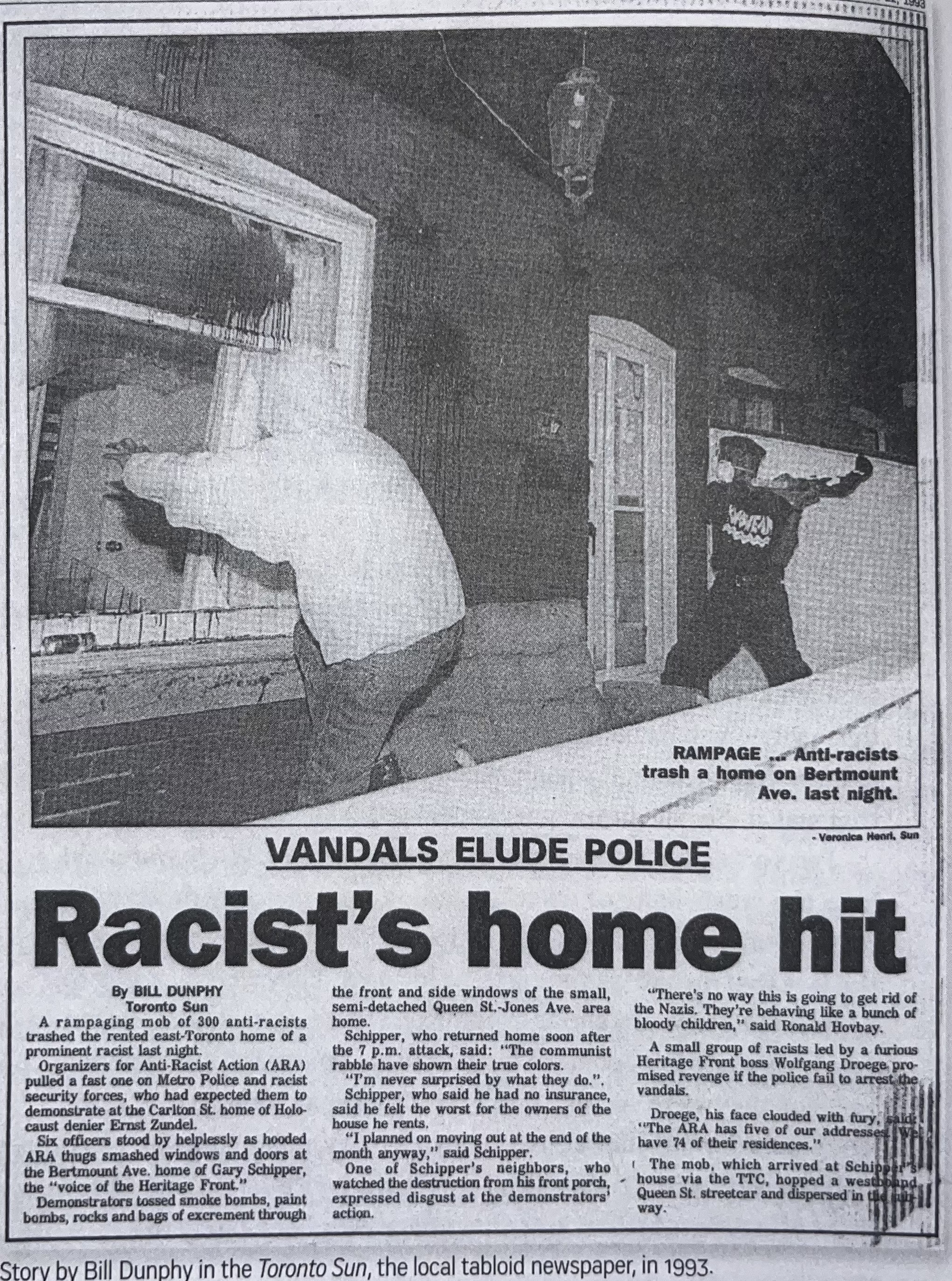 Anti-Racist Action, an organization of young radicals and anarchists that was active from the late 1980’s through the early 2000’s, militantly confronted neo-Nazis, Klansmen, anti-abortion extremists, the police, and other far-right groups. They pulled up on Klan and Nazi rallies to force them out of suburban enclaves, often getting into fist fights with white supremacists and facing arrests, since that’s what it took to take on fascist forces. Their slogan was “we go where they go,” which meant the opposite of dumb shit like “just ignore them!” that people today yell at protests infiltrated by violent Zionists. In one example, ARA members went door knocking in a Toronto neighborhood where they had identified the address of a prominent neo-Nazi leader. They passed out flyers to the neighborhood’s residents, rallying support against the enemy within and exposing him. They then led a march through the neighborhood, during which the Nazi’s house got “renovated” by ARA members (Clay et al., We Go Where They Go: The Story of Anti-Racist Action, pp. 61-63, 80-83).