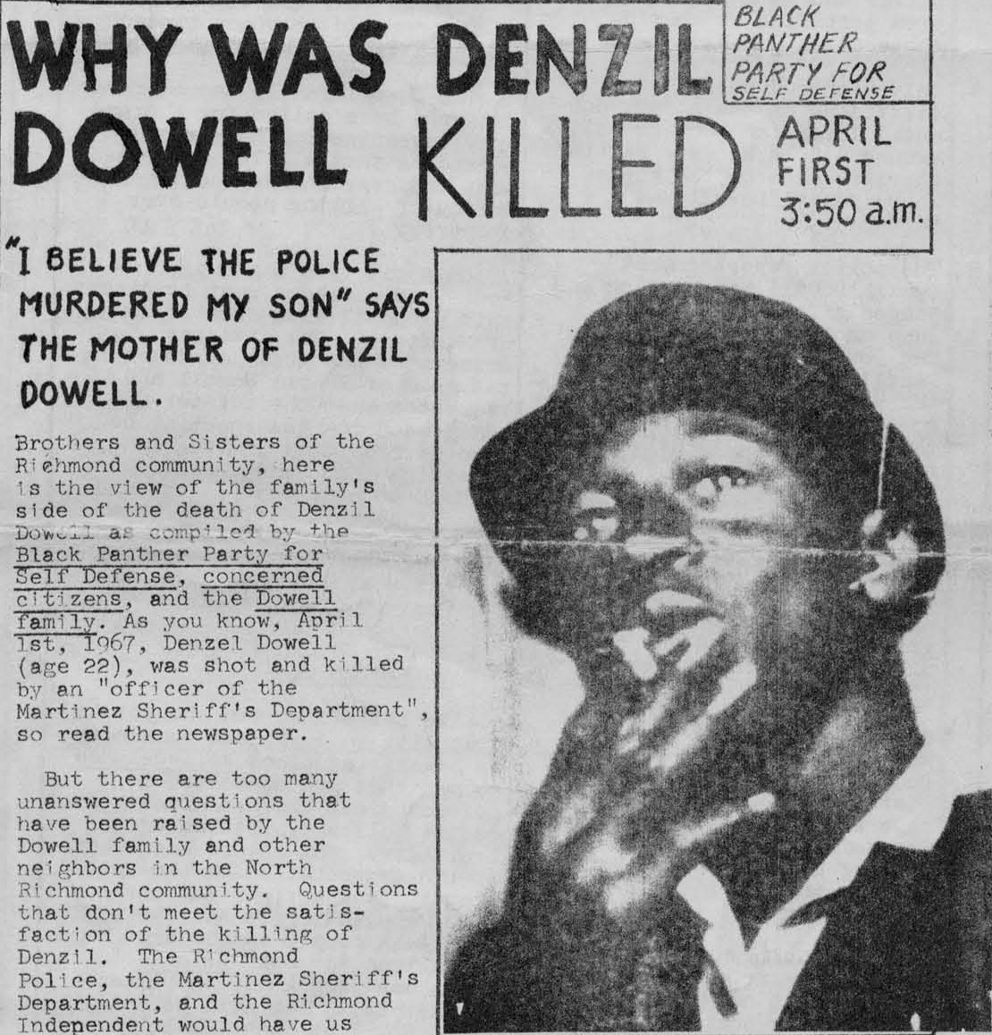 In 1967, in the early days of the Black Panthers, Denzil Dowell was murdered by police in North Richmond, CA. His family immediately knew the police report for the killing was full of fabrications, and Denzil’s sister Ruby soon called a meeting that Huey Newton and Bobby Seale attended. Bobby and Huey boldly put forward that only collective resistance and armed self-defense would put a stop to police murders in their neighborhoods. After the meeting, the Panthers kept going back to Richmond, launching their own investigation and deepening their ties with Denzil’s family members. They held a rally on a street corner, pulling in a crowd of 150 people who were drawn by the spectacle of over a dozen armed Panthers. The Panthers managed to chase off police who tried breaking up the rally, one of many successful confrontations that required some real revolutionary authority and significant mass support to pull off (Black Against Empire, pp. 50-57).