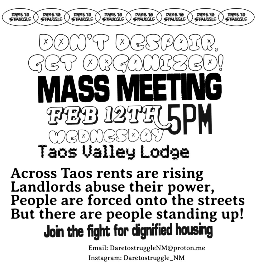 New Mexico Monthly Mass Meeting. Join us at 5pm on Feb 12 at the Taos Valley Lodge to learn about our campaigns and how to get involved!