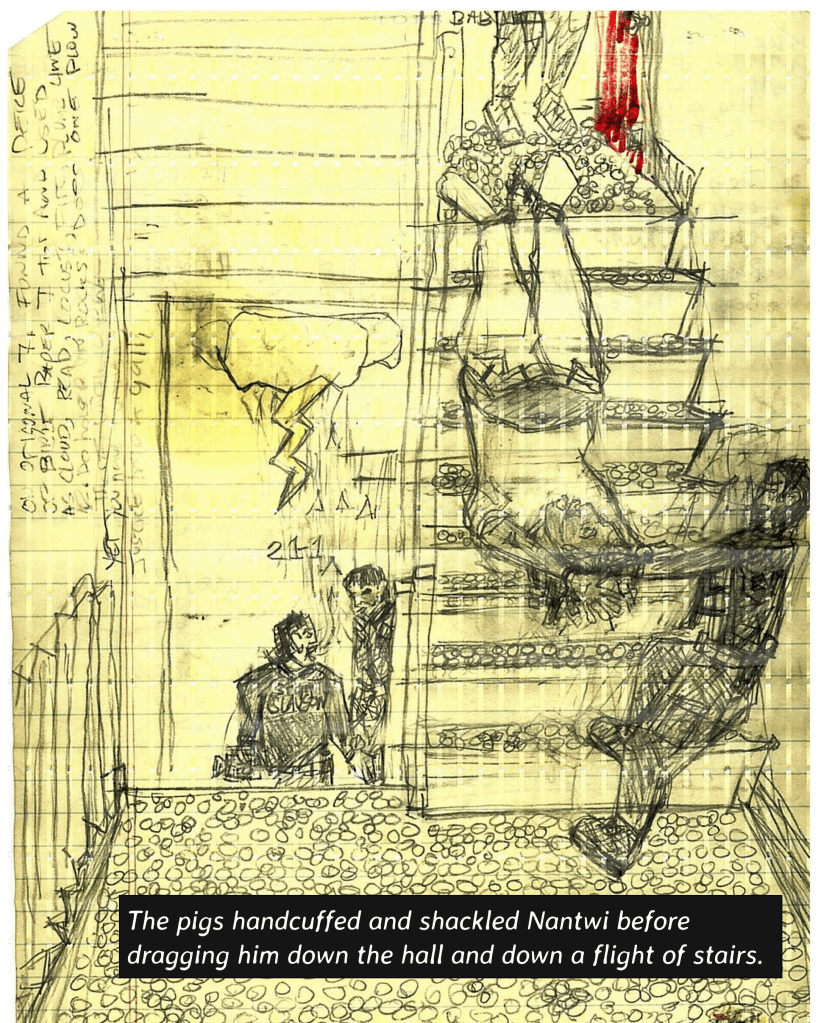COs regularly retaliate against prisoners who report abuses and mistreatment. Despite this, inmates chose to publicly come forward about the killing. Dare to Struggle wrote these inmates letters of support and encouragement. We received letters back, including drawings of the scene of Messiah’s murder. M Cleaver, artist and inmate wrote: