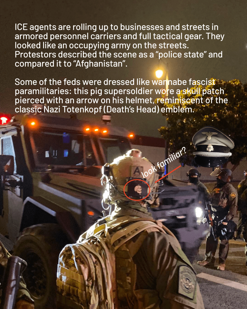 We have a few questions. If they’re so outraged, why aren’t LA’s “progressive” politicians putting their bodies on the line to block ICE vehicles like some Chicago aldermen did? If Karen Bass is so outraged, why did she deploy hundreds of riot police to smash the protests with tear gas, flash bands, batons and rubber bullets? If LA is a “sanctuary city”, why is LAPD helping ICE raids go smoothly and stopping residents from confronting the feds?