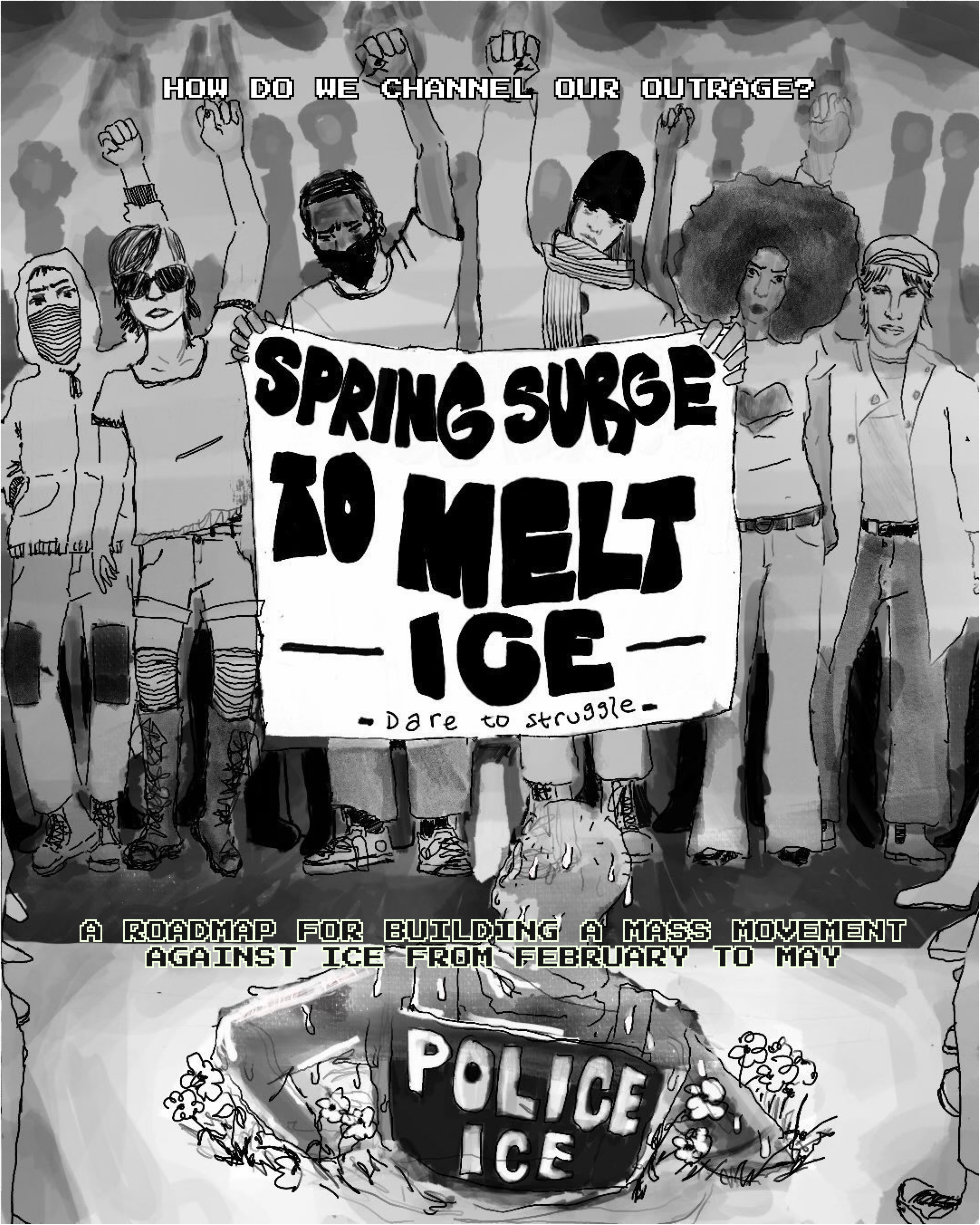 ICE is on a killing spree Police and politicians are protecting ICE and thousands are suffering in detention centers. Only the people can stop this and make them pay for what they’ve done. Dare to Struggle is leading defiant resistance against ICE across the country. We must spread the opposition picking up in Minneapolis and … Continue reading A Spring Surge to Melt ICE: A roadmap for building a mass movement against ICE from February to May