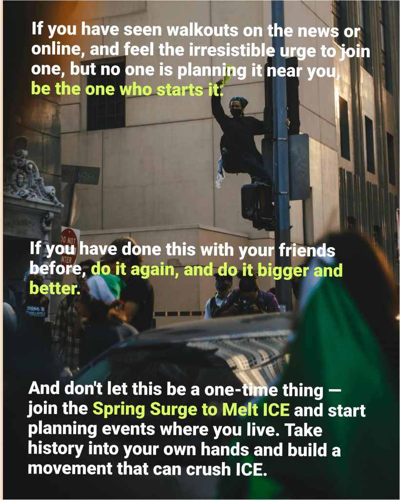 We suggest reviewing “Take the Streets or Stay on the Sidewalk: Lessons from Anti-Ice Protests in Orange County.“ for practical guidance and “ICE executing Renee Good kicked off militant protests around the country. Where do we take it from here?” for political context before the walkout. If you need any help, hit us up on insta. We want to support your effort and boost it!