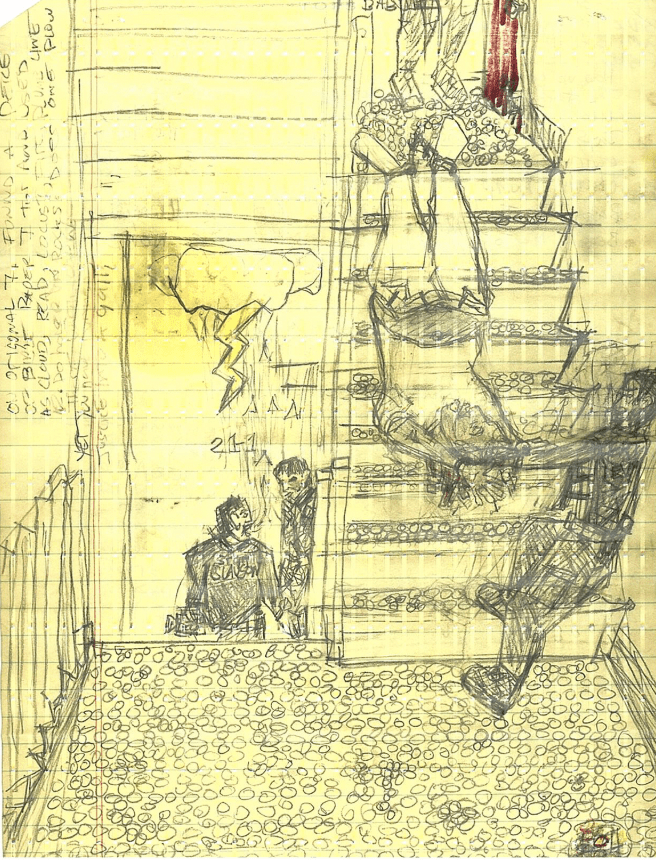 I spent the next two weeks drawing the scenes exactly as witnesses agreed on. We were visited by the first Black legislator with a felony on his record. He had supported his family as a child selling crack, killed a man, and turned himself in. Everyone agreed I should give my drawings to him. But he had no time for me or my crummy drawings. He did not even look at them. I kept them, I was annoyed.