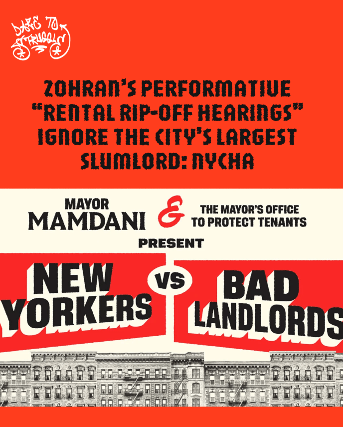 This forum’s dedication to the city’s private landlords directly contradicts a statement from Zohran himself, “I want these hearings to expose the ugly underbelly of our city” he claims while ignoring the over 500,000 residents that live in the ugliest underbelly, under the slumlord that is the New York City Housing Authority.