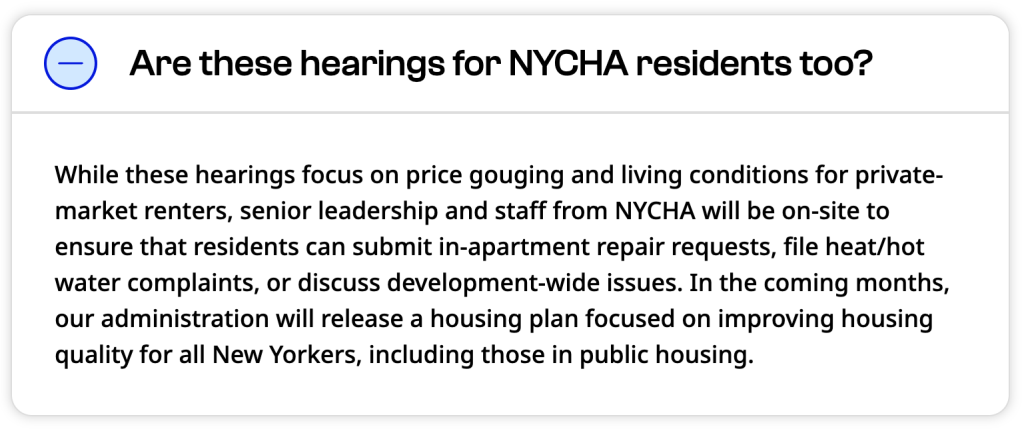 What is only mentioned on the very bottom of the page, the very last FAQ, is that NYCHA residents are not included in this open invitation for tenants to share their grievances.