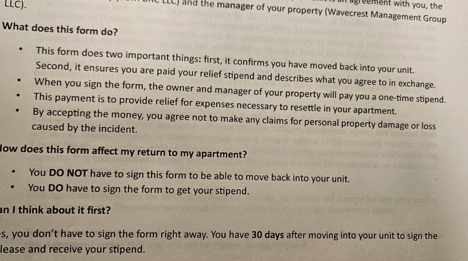 Now that residents are moving back into building 1, Wavecrest is offering people stipends but residents call it what it is: hush money. Households are being offered hush money based on their apartment size, but to receive the money they have to sign off that “you agree not to make any claims for personal property damage or loss caused by the incident.” In many cases, this money doesn’t even cover the costs incurred from damaged belongings, let alone medical bills and lost jobs. Wavecrest Management is trying to cover their asses but Boston Secor residents see right through it.