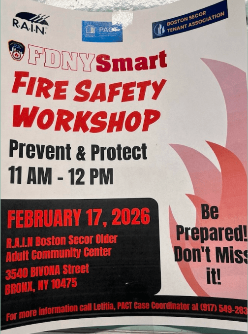 This flyer was sent to building 1 residents, with PACT, the RAIN Center, FDNY, and The TA all listed as sponsors of the meeting. On the day of the meeting, we showed up with residents and were met by a PACT representative, Leticia, who wouldn’t let anyone past the lobby. She gave us multiple excuses for not being allowed into the meeting to ask questions about the building fire.