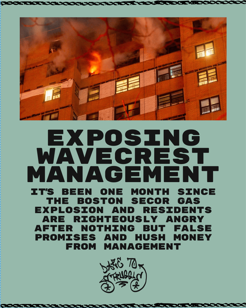 It has been exactly one month since the gas explosion that killed a resident, hospitalized many others, displaced hundreds, and left 4 buildings without gas. Wavecrest Management and their cronies -PresLog, Red Cross, PACT, and the TA- have left residents without safe homes, care, or clear information. They’ve rushed residents back into building 1 just in time for March rent. Still, everyone is left wondering, when will the gas be turned on? What structural repairs have been done to make building 1 safe again? Are any of these buildings really safe?