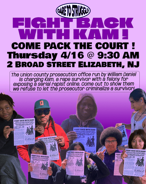 We demand Union County Prosecutor William Daniel drop the charges against Kam, and actually go after the rapist who has the prosecutor’s office protecting him and doing his misogynist bidding for him. Daniel thinks he can get away with criminalizing a survivor but we refuse to accept these bullshit charges!