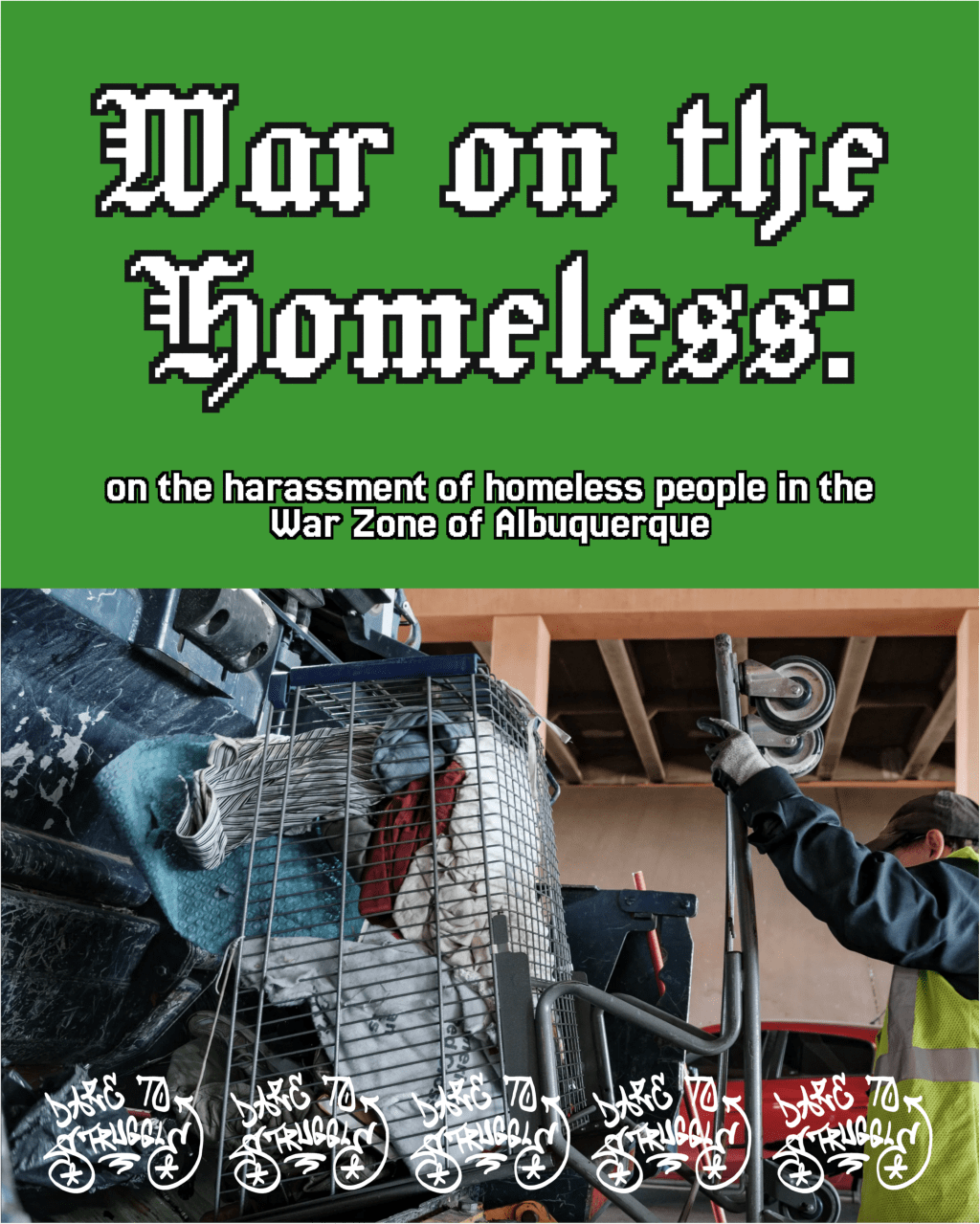 The city officials of Albuquerque have long tried to rid the International District neighborhood of its nickname the “War Zone.” From the retro aesthetics of the Historic Route 66, to the plans for a sports stadium at the Fairgrounds, city officials operate under a guise of community improvement, while the poorest in the neighborhood continue to suffer. Despite these “revitalization” efforts, residents living there continue to call it the War Zone because the nickname reflects reality: in the southeast of Albuquerque there is a military style occupation. Here the Albuquerque Police Department (APD) relentlessly criminalizes and harasses the homeless and anyone who lives there. Cops block off side streets and hold people for hours to run warrants. APD tackles and arrests people for running away when they pull up. City garbage trucks come by every morning to destroy people’s belongings that get left behind during sweeps. People are arrested for simply existing in the wrong area. The cops brutalize people on a whim. This whole other world of police brutality and harassment is one that city officials would like to keep out of sight and out of mind of the general public. They claim to be helping out the homeless in the War Zone and cleaning up the neighborhood. But beyond these politician’s lip service and measly “services” are their own policies that plainly enshrine cruel punishment of the homeless and function as the engine for their war on the homeless.